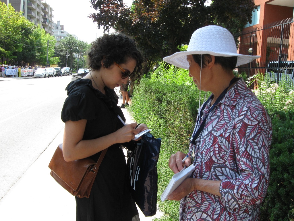 十八日上午,来自大多伦多地区的法轮功学员来到中领馆门前的街道,平静而井然有序的站在人行道的一侧;手举横幅,上面写着:“法轮大法好”、“真善忍好”、“解体中共,结束迫害”、“立即释放被关押的法轮功学员”等标语。正值上班时间,到领馆办事的路人都纷纷停下来观看和聆听集会发言,有路人当场签名制止迫害,有不少华人接过真相资料并道谢。