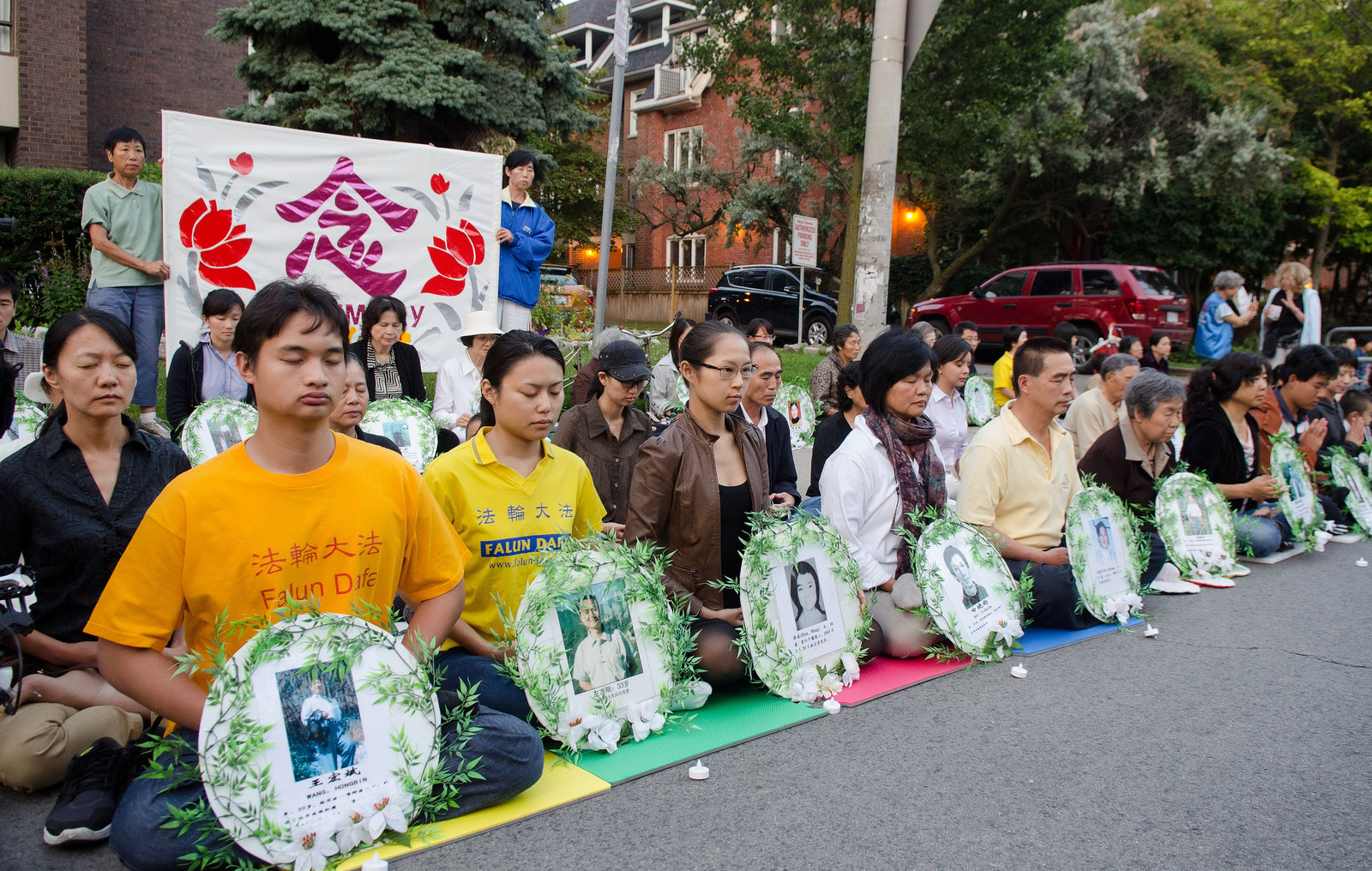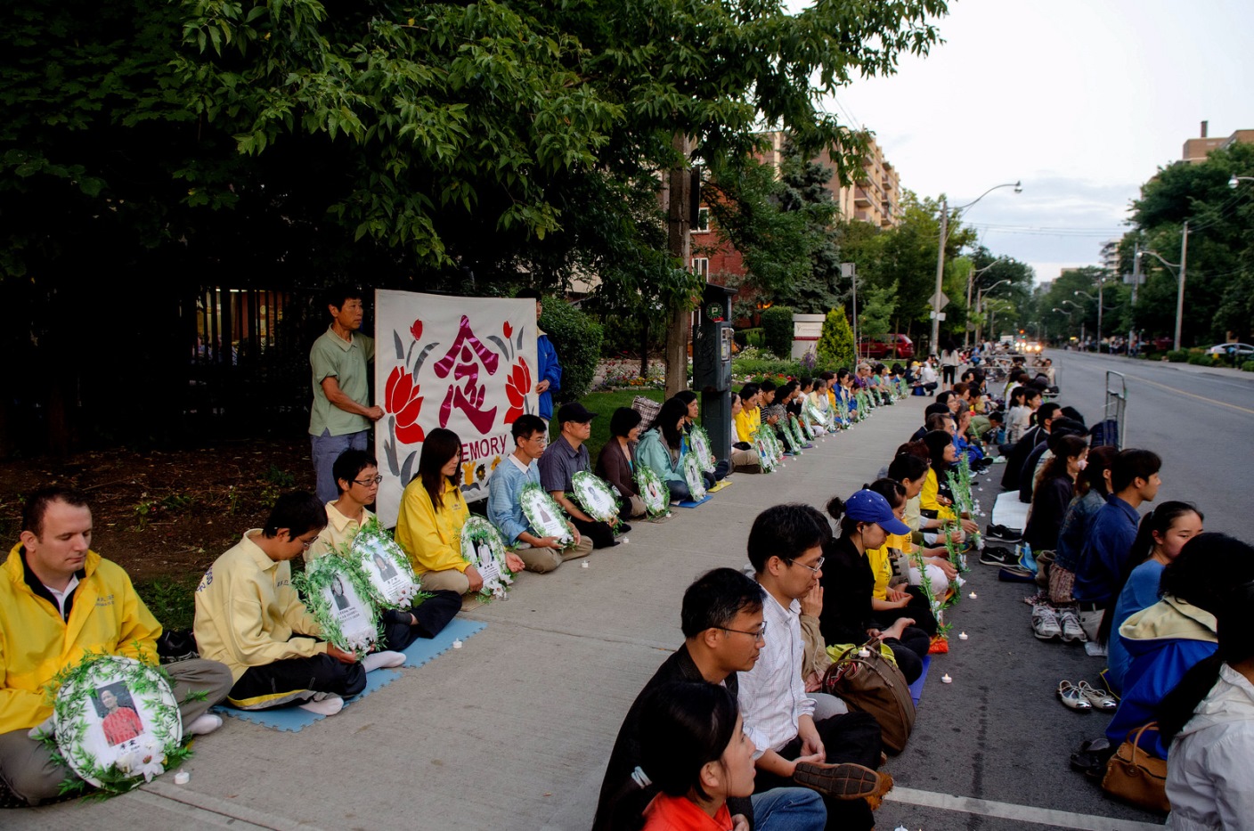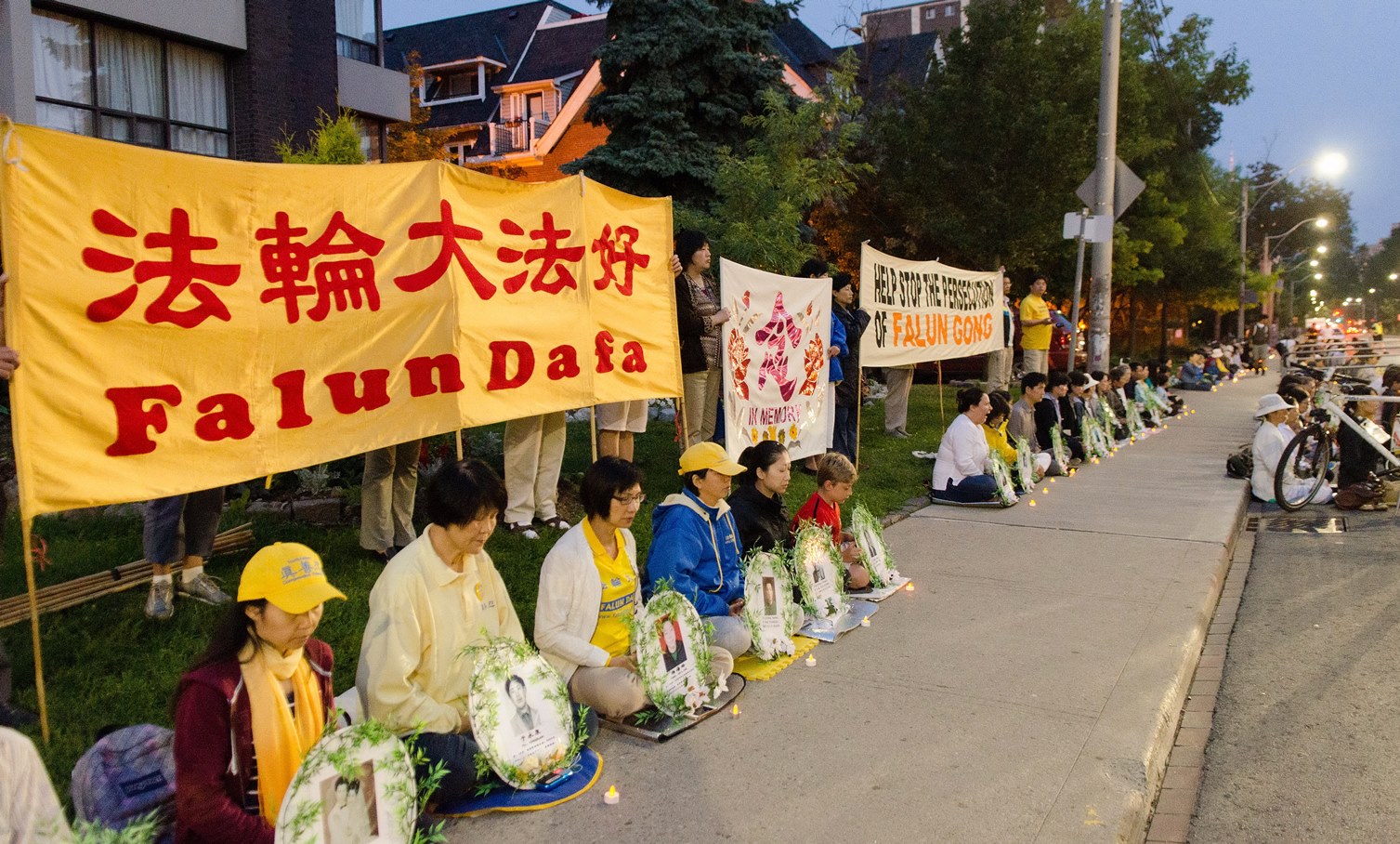 星期日(二十日)晚的烛光悼念,场面祥和且肃穆,中领馆前的街道,人行道的一部份,以及警方划出的部份街道路面上,坐满了法轮功学员,绵延二、三百米,学员手捧着被迫害致死的法轮功学员的遗像,默默悼念,无声地控诉中共的罪恶。有的在现场征签,有的给华人现场做三退。