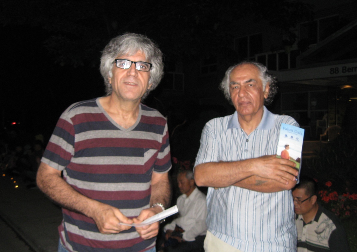 图14:在加拿大居住了二十多年的Sam Mimi(左)和朋友看到烛光悼念的场面,他说:“对法轮功的镇压是一个历史性的罪行。”