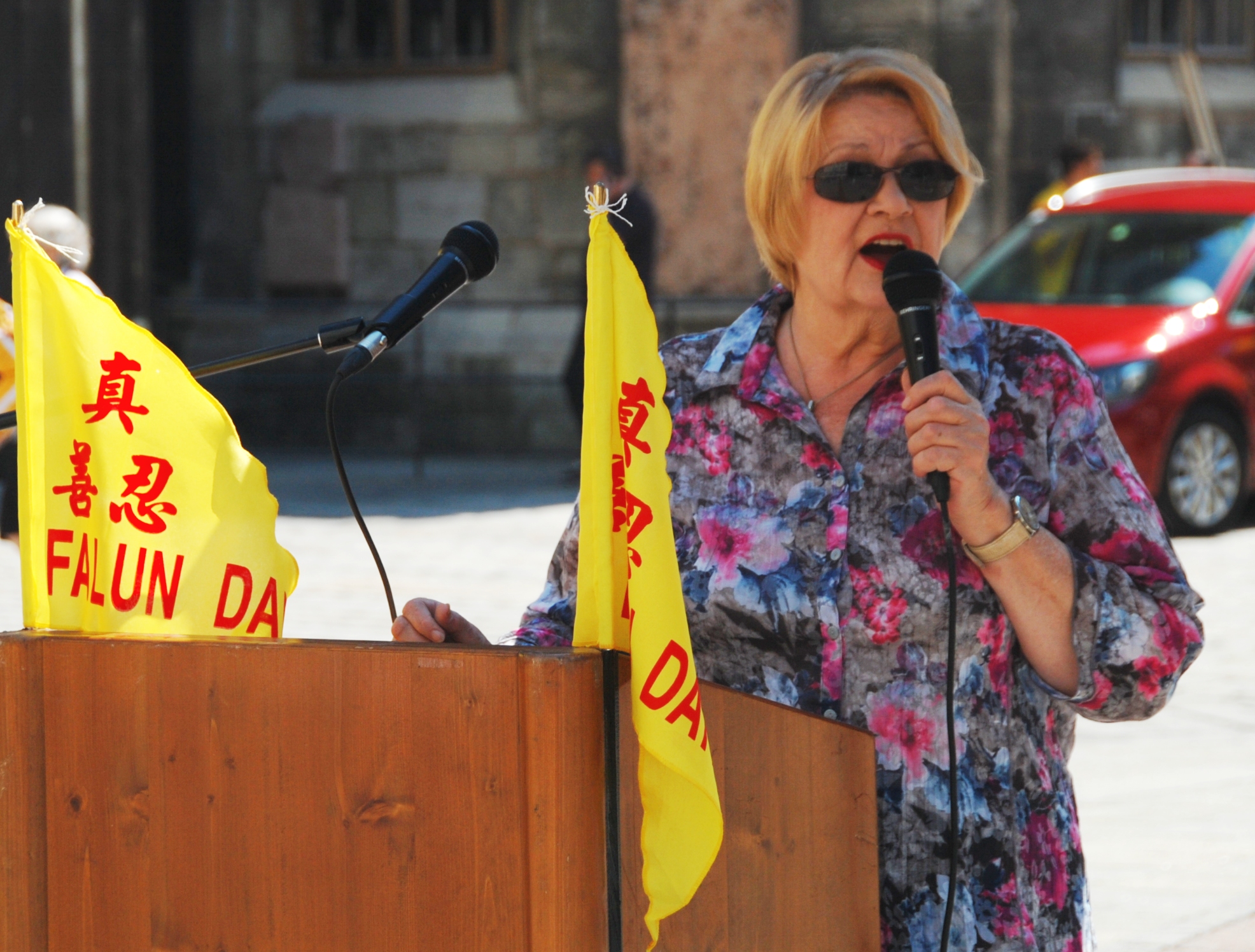 奥地利国际人权协会主席卡特林娜•葛蕾布参加法轮功学员在维也纳斯蒂芬广场的集会并发言