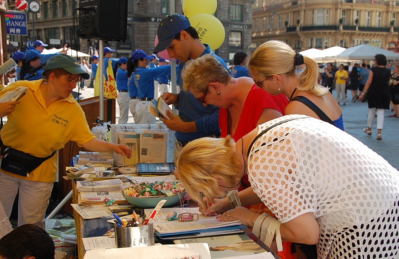 法轮功信息桌前,人们签名谴责中共迫害