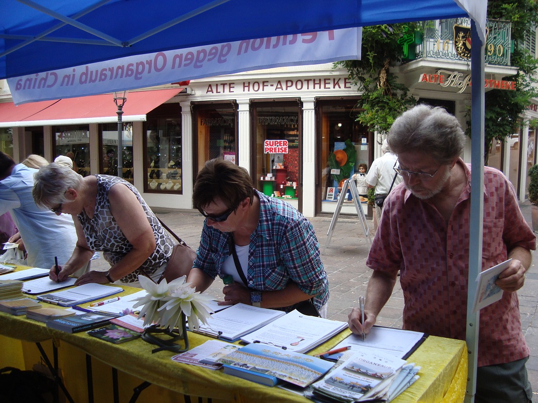 ![]() 巴登巴登市的法轮功信息日活动中,民众签名谴责中共暴行 |