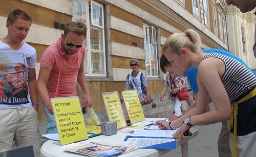 法轮功反迫害十五周年之际,波兰法轮功学员从六月下旬开始,每周末在华沙古城及克拉科夫古城设立法轮功真相展板点和征签台。一队中国游客来到华沙古城观光旅游,突然就听有个人大声说:“喂,快看啊,老外法轮功!”