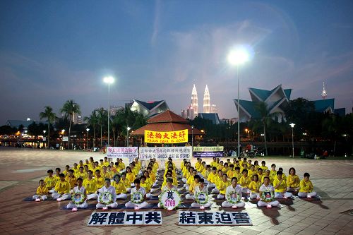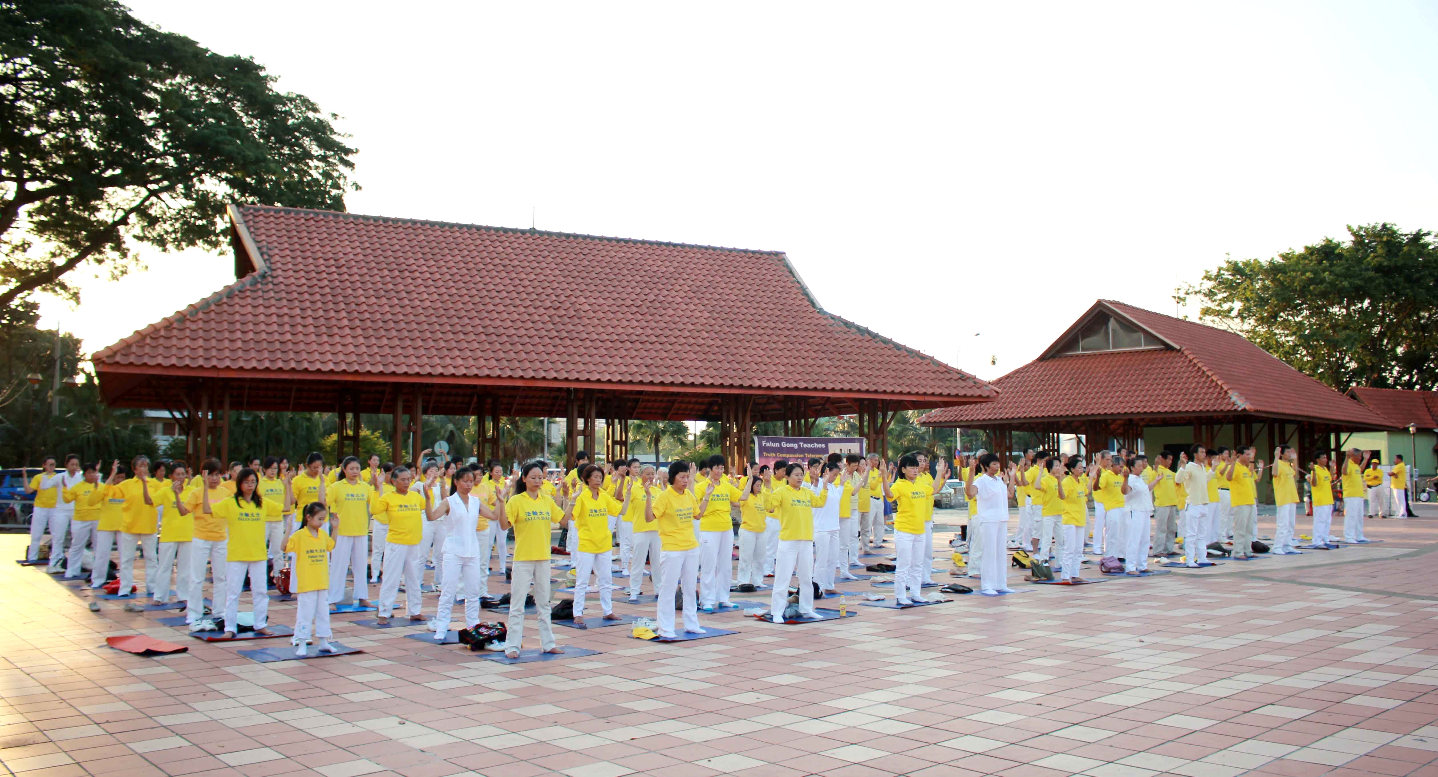 ![]() 在吉隆坡蒂蒂旺莎公园举行的720烛光追悼会开始前,法轮功学员进行集体炼功。 |