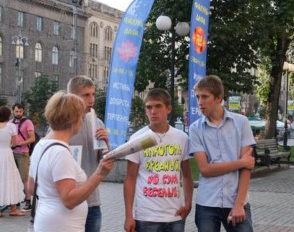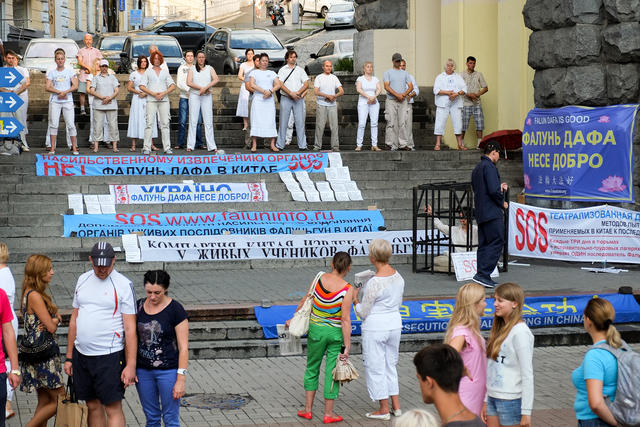 在基辅市,学员以真人演示的酷刑展,真相图片展,各色横幅,以及功法演示,告诉人们:法轮功是什么,中共对法轮功学员的迫害是如何的残酷。