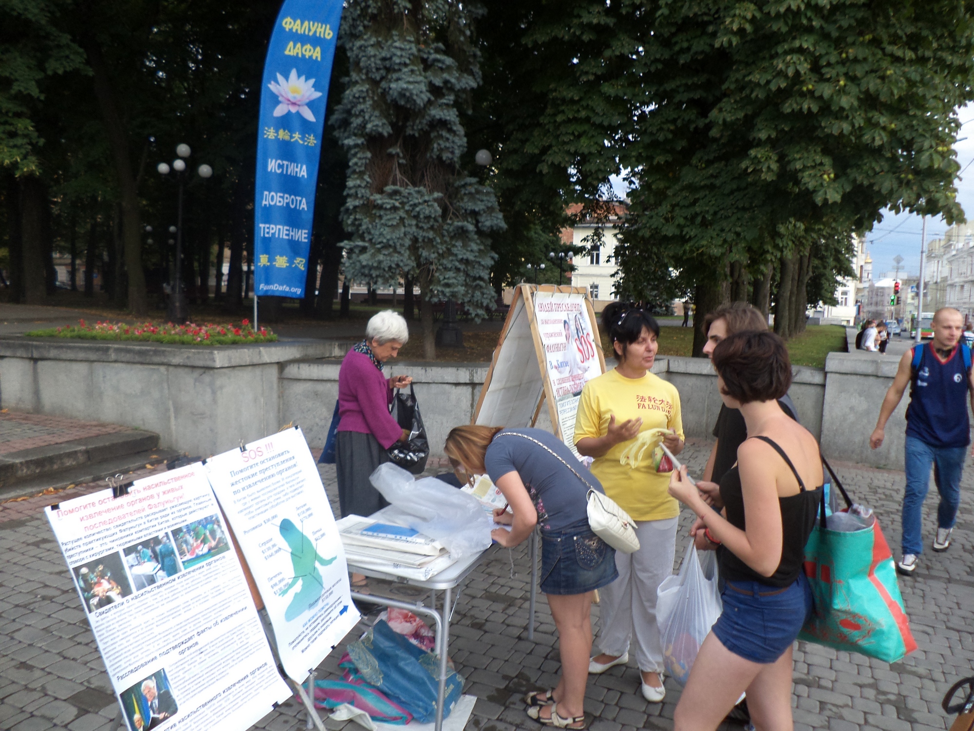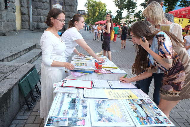 图7:在哈尔科夫市的真相点,人们经过时看到揭露中共酷刑折磨法轮功学员的图片,纷纷驻足了解真相。明白真相后,人们立即在“反对中共强摘法轮功学员器官”的征签表上签名。