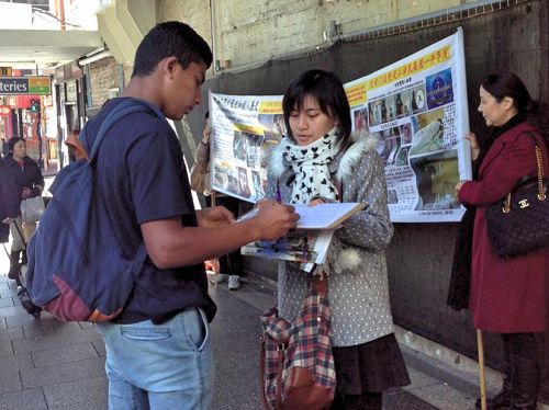 二零一四年七月二十七日,悉尼法轮功学员在博霍德市中心的主街上举办真相长城和征集“制止中共活体摘取法轮功学员器官的罪行”的签名活动。