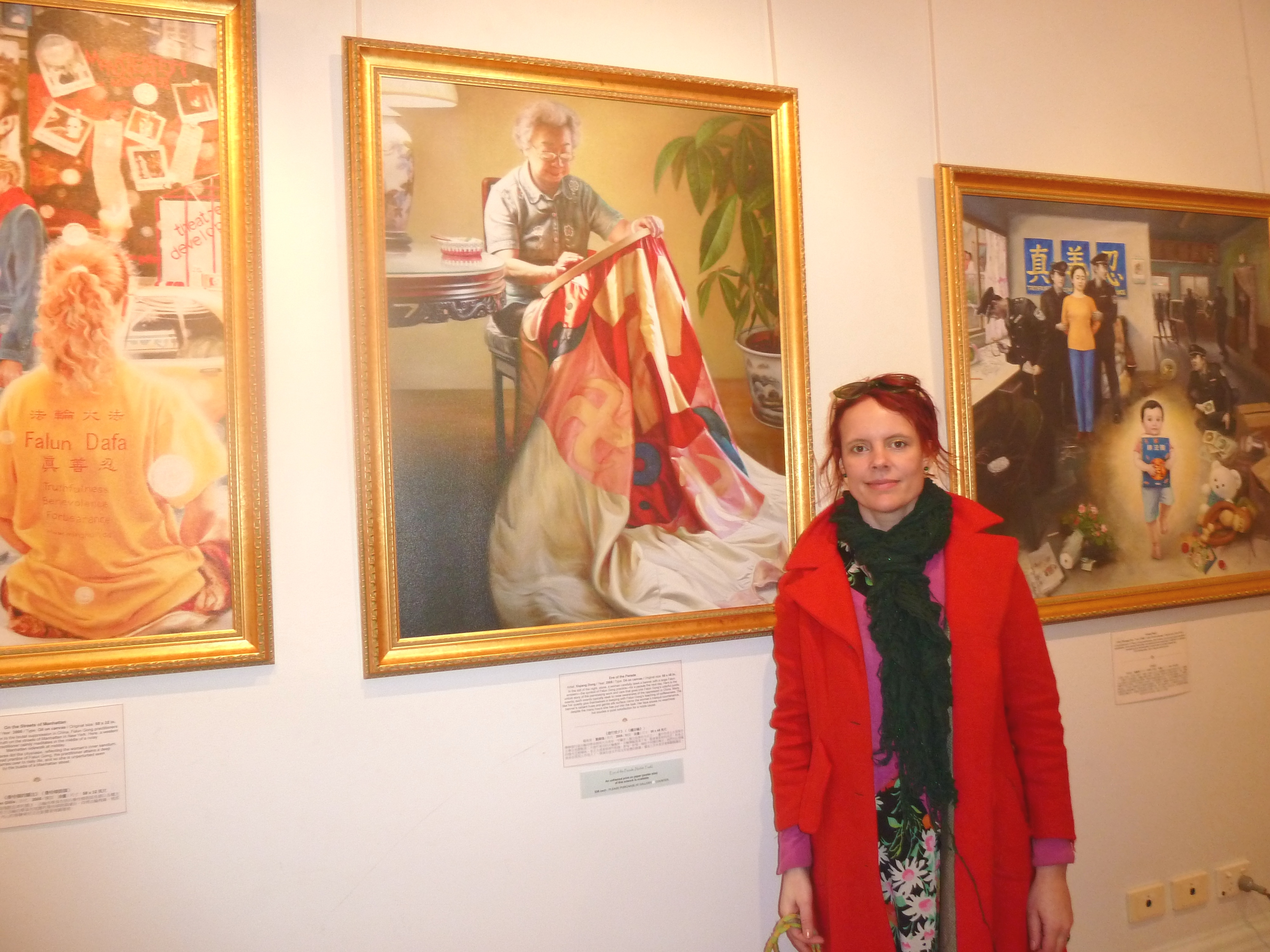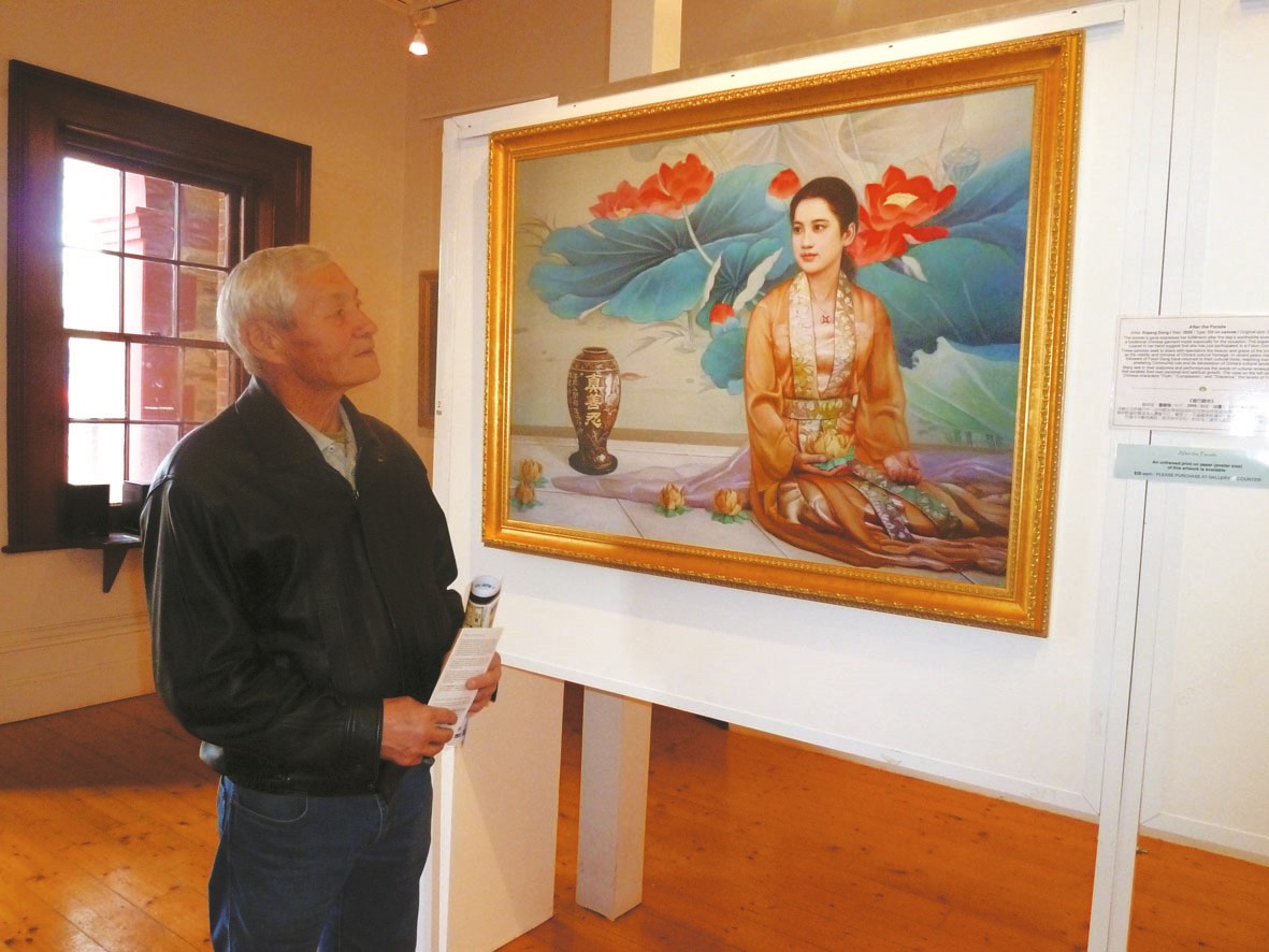 米琳斯女士( Mrs. Bev Millins)在画廊停留了很长时间,细心观赏、品味一幅幅画作。她最喜欢作品《佛像》,令她感受到佛的强大慈悲和善的能量。她说:“所有这些画都触动着我,令我深深地感动。画家们用不同的手法表现了多种不同的生活故事和背后的精神。对我来说,这个美展无论是在主题上还是在艺术上都是惊人的!因为我觉得面对如此严酷的不公正的迫害,他们仍能坚持选择信仰。我也喜欢美展展现的勇气和希望,令人震撼。”