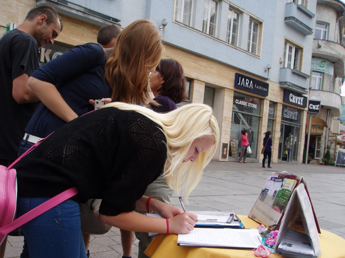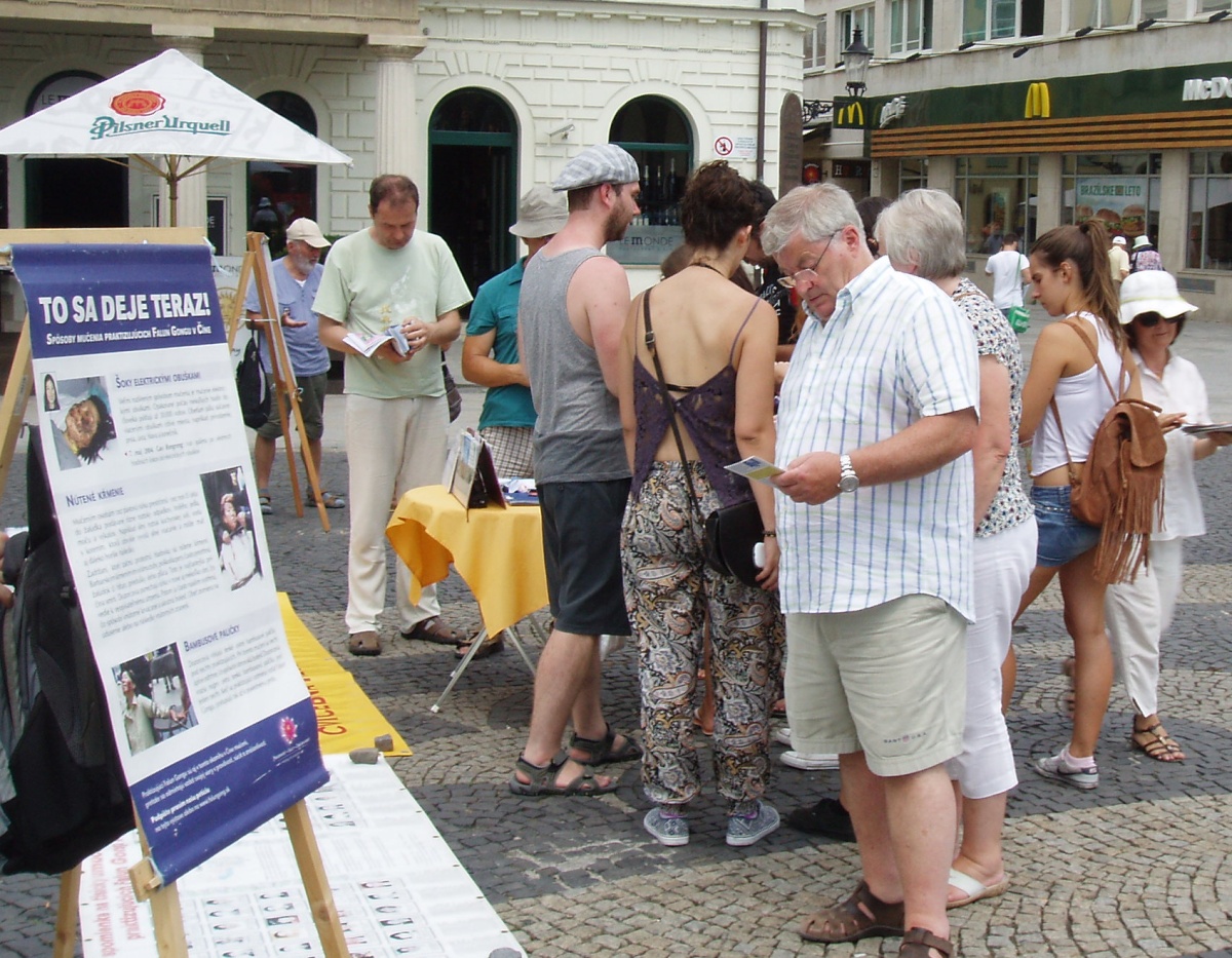巡回真相展室从七月二十一日首都布拉迪斯拉发(Bratislava)开始,在首都Hviezdoslav广场上,很多游客都由兴趣的停下来了解真相,并在反对迫害的征签簿上签名。游客当中不乏来自中国的大陆游客,他们当中有些人也索取了真相资料。