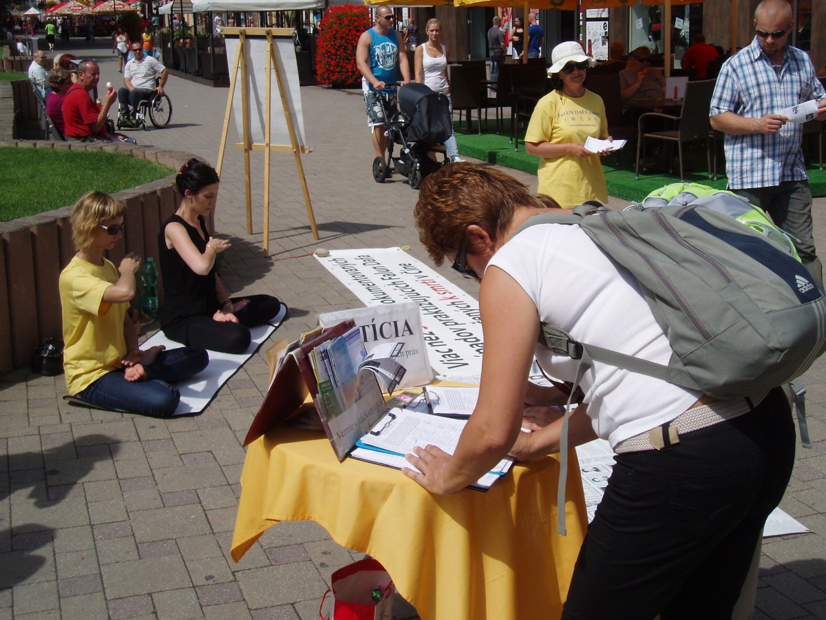在中部城市鲁容贝罗克(Ruzomberok)和普勒索夫(Presov)的中心,除了展示五套功法,法轮功学员们还教民众折叠纸莲花,很受欢迎。在鲁容贝罗克,很多人都表示他们还记得自己国家历史上的共产主义政权时期,很容易理解今天中共对法轮功的迫害真相,人们纷纷在反对迫害的请愿书上签名。
