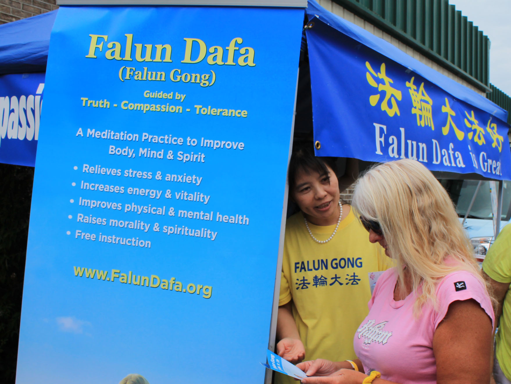 许多从展位前经过的游客接过法轮功学员递过去的真相传单,了解到在中国大陆法轮功学员无辜遭受中共迫害的真相,他们感到震惊,并签名“呼吁中共立即停止活摘法轮功学员器官的罪行”。有的游客对法轮大法的神奇很感兴趣,现场表示要学炼功。