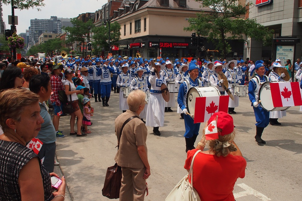 【明慧网二零一四年七月四日】二零一四年七月一日是加拿大国庆日,加拿大日游行作为蒙特利尔城每年最重要的两个节庆游行之一,汇集了来自全世界各族裔的移民参加和观看。由纽约、蒙特利尔、魁北克、渥太华的法轮功学员组成的天国乐团,第七次参加蒙特利尔的加拿大国庆日游行,受到观众的喜爱和欢迎:有观众说每年特意为他们而来;有华人观众表示法轮功的队伍服饰精美,很好地诠释了中华文化;还有华人夫妇主动希望和天国乐团合影,留下美好的记忆。