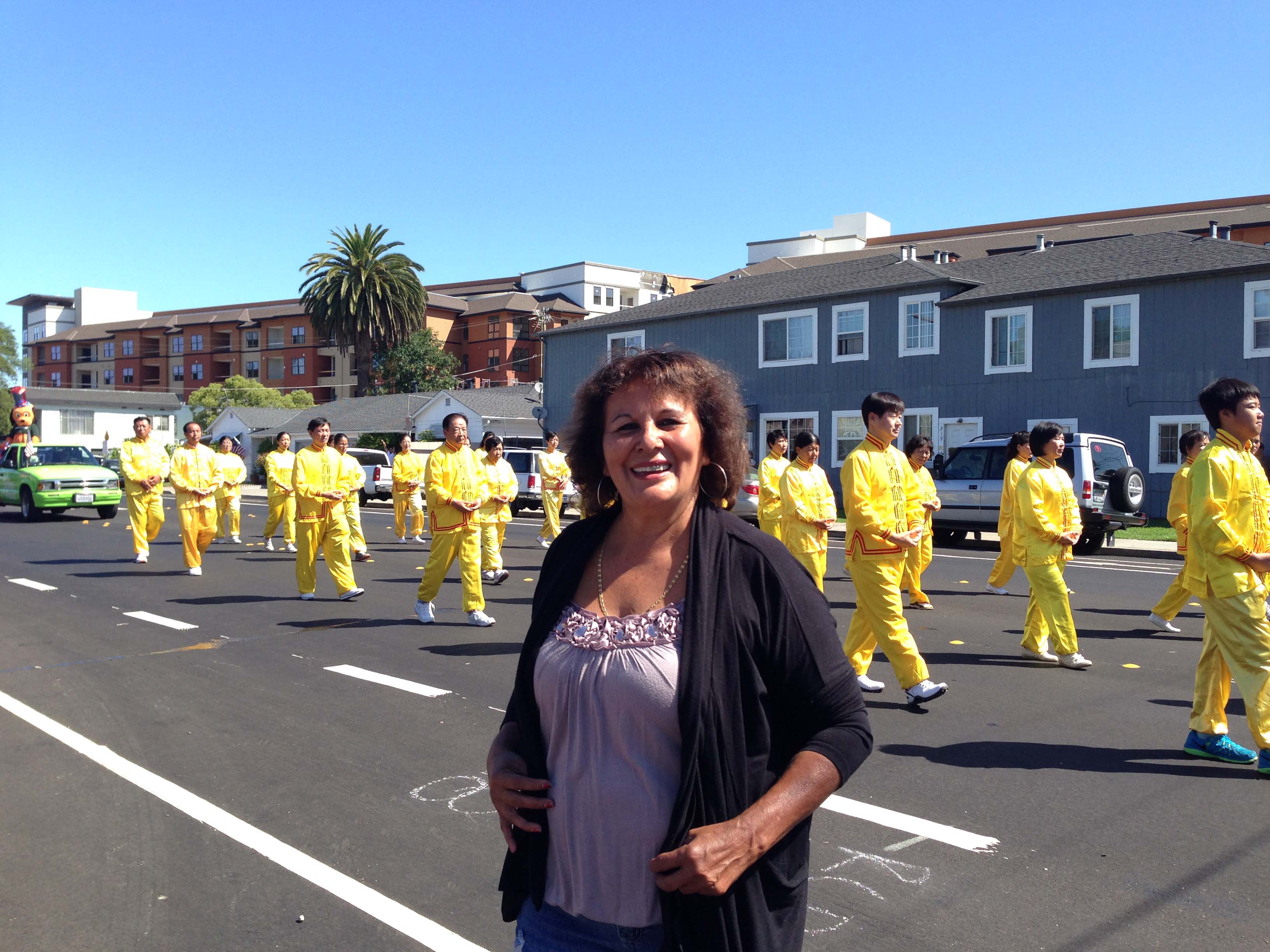 ![]() 西裔观众弗洛拉说,她喜欢法轮功的队伍 |