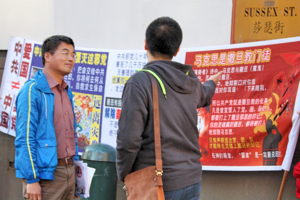 “三退”义工Wenny介绍说:刚从中国大陆来学习了两个月的留学生,不知道这是什么活动,Wenny告诉他:“我们是在讲真相,做‘三退’。”这个留学生问:“有这么多人退吗?这数字是真实的吗?”Wenny回答说:“这数字包括退出党、团、队。”留学生“哦”了一声明白了,又问:“不付钱你可以给我这张报纸吗?”Wenny回答说:“可以,本来这些报纸都是免费赠阅的,不收钱。”留学生又问:“你们这么多钱印资料,哪来的钱呢?”Wenny说:“这些义工自己掏钱去印资料的,是为了你们好!”留学生吃惊地问:“为何为了我们好呢?”Wenny逐一告诉他“三退保平安”对人的重要性,留学生说:“原来是这样啊!”Wenny又说:“一个生命是很值钱的!他一旦明白了真理就更是无价之宝了。所以每个义工都愿意掏钱去印资料,传递给你们。”留学生觉得义工们这么善心,就多拿了些真相资料,准备回去更多更深入地了解法轮功真相,因为今天他是第一次看到、听到真相,最后留学生还是用“王顺”这个化名退出了中共团和队。