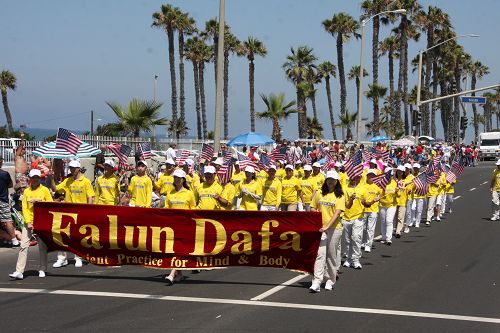 ![]() 超过百人的法轮功学员方阵作为游行中唯一的华人队伍参加了杭庭顿海滩市的游行 |