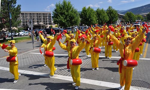 法轮大法学员的队伍由“Falun Dafa Is Good”(法轮大法好)的横幅开道,身穿黄色印有“法轮大法 真善忍”字样服装的炼功队紧跟其后,之后是大莲花花车和腰鼓队。