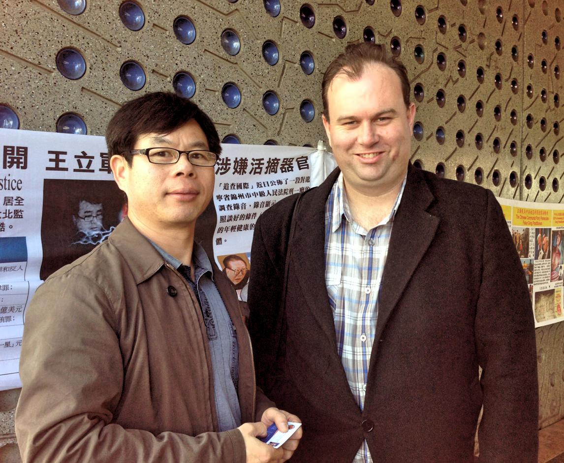 帕拉玛塔市议员詹姆斯•肖(James Shaw,右)向法轮功学员了解真相