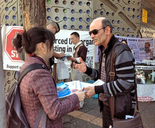 他告诉学员,他曾收到一封诋毁法轮功的信,他本人不了解法轮功,今天正好看到法轮功学员在这里,就想顺便停下来了解一下。他看了展板,反复听了几位法轮功学员介绍,并特意问了一下当地华人对法轮功的态度。了解了法轮功真相后,他表示:“我支持这个征签活动,支持这个法案,我认为这事关人的尊严。我知道中国在发生的这些违法的虐待(行径),澳洲应该站出来(伸张正义),是时候了。”