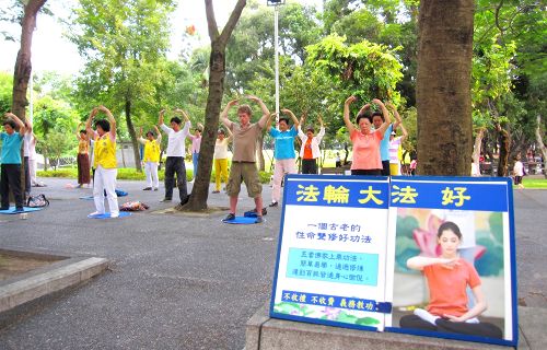 【明慧网二零一四年八月十六日】早晨四点五十分天渐亮、台北市荣星花园一片幽静的树林间,从那平整的抿石子做成的高层平台上,传来阵阵让人身心都充满了祥和、宁静、能量的炼功音乐,远处一望,平台上放着醒目的展板“法轮大法好”。