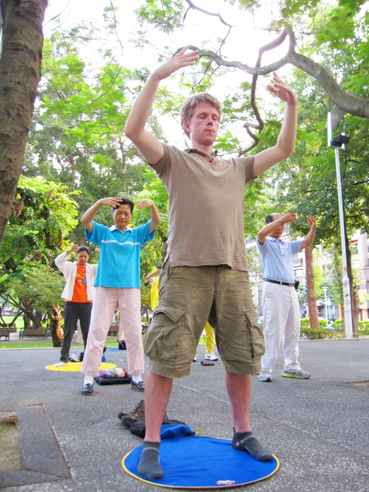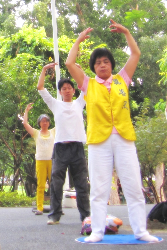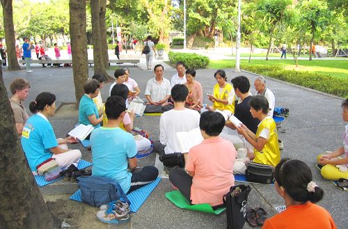 在荣星花园晨炼的学员,有刚刚入门的新学员,也有炼了十八年的老学员,还有远从加拿大来台湾学中文的西方学员。听他们分享在修炼中的喜悦和收获,不禁感慨海峡对岸法轮功仍在无辜遭受中共迫害。但中共的打压掩盖不了佛法的光辉,法轮大法如今已经洪传世界,每一个修炼人身心升华的经历都是法轮大法造福于人的例证。