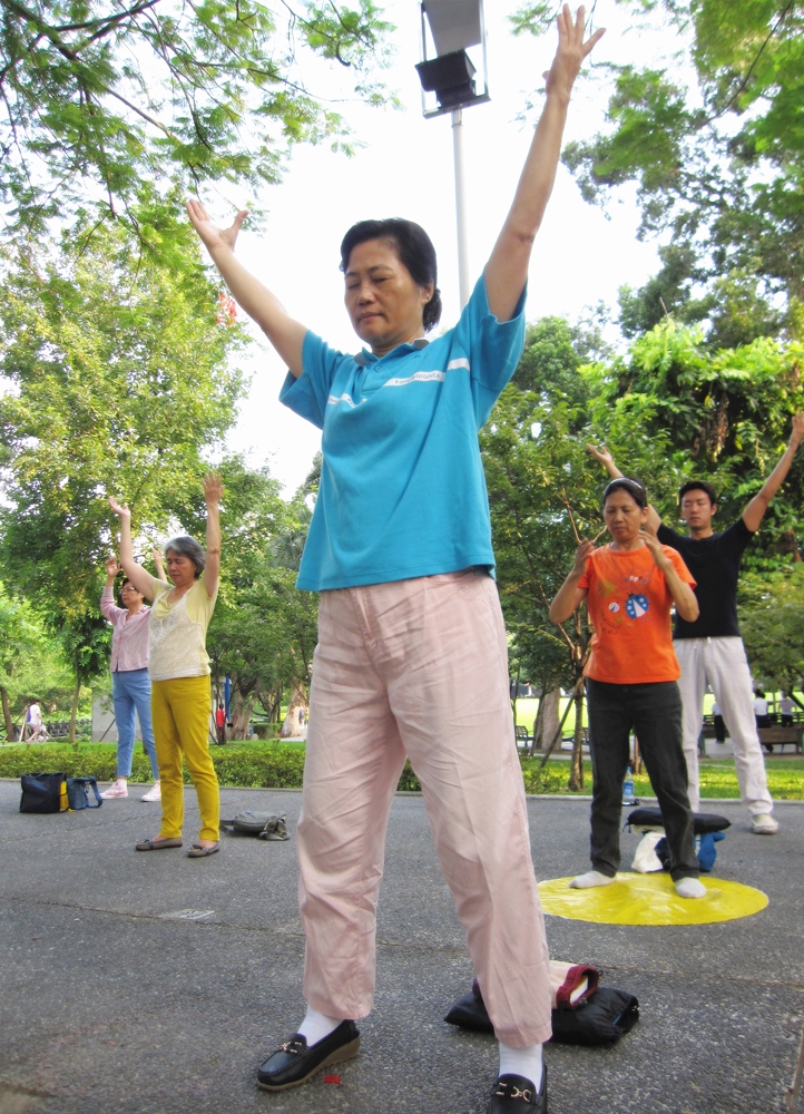她每天都要求自己要五套功法一步到位,亲朋好友看她在公园里炼功,问打坐那么久会不会影响血液循环,她说不会啊,觉的一身轻,走路生风。她介绍亲朋好友可以先看《转法轮》,而在户外炼功清风徐徐吹来,不亚于在家里吹冷气,美妙无比、语言难以道尽,真的是一件非常快乐的事情。