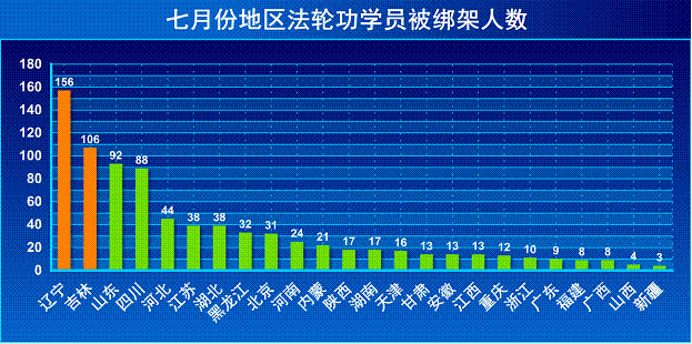 据截止到八月十三日的明慧网资讯统计,从七月一日到三十一日,中国大陆共有821名法轮功学员被绑架,而辽宁、吉林恶警绑架法轮功学员最为疯狂。辽宁156位法轮功学员被绑架,吉林106位法轮功学员被绑架,位全国一、二,如下图所示。