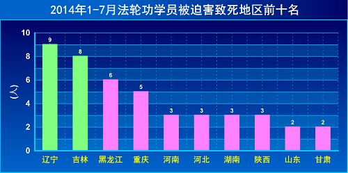 今年头七个月,全国十九个省有56位法轮功学员被迫害致死,而辽宁、吉林法轮功学员被迫害致死人数就有17位,分别居全国一、二位。如下面图所示。