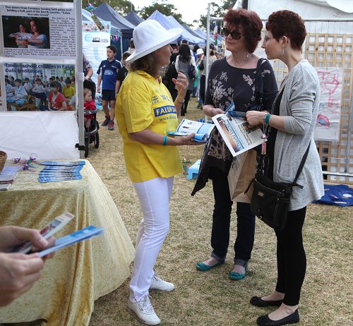 图1-2:法轮功学员在澳洲图文巴语言和文化节上向当地居民及游客讲述法轮功真相。