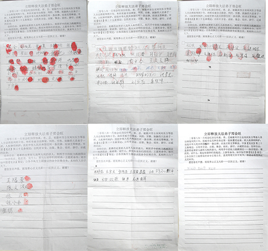 有个大娘说:“我听说过法轮功被迫害的事,我也知道炼法轮功的都是好人,郑会旺是被冤枉的,他没犯法,中共不讲理,我们可不能不讲理,我签名声援。”