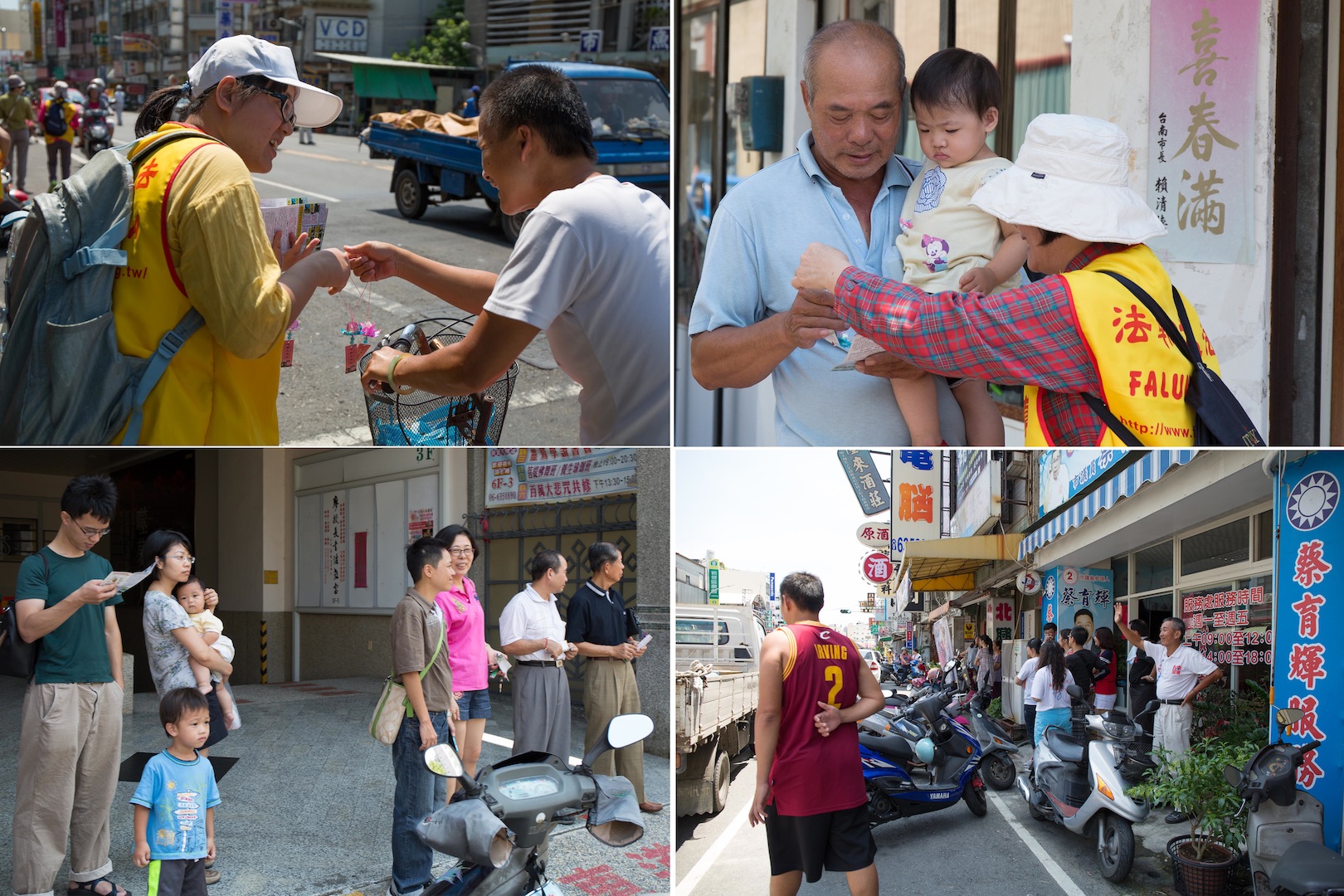 在佳里公园聊天的一群老婆婆,这是第一次看到法轮功游行队伍非常好奇,看到传单上五套功法的图片马上就比划了起来,觉得炼功动作非常简易舒服,后来才发现原来这个公园清晨有人在炼法轮功,她们也想开始学炼。