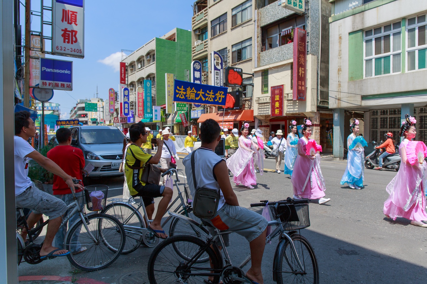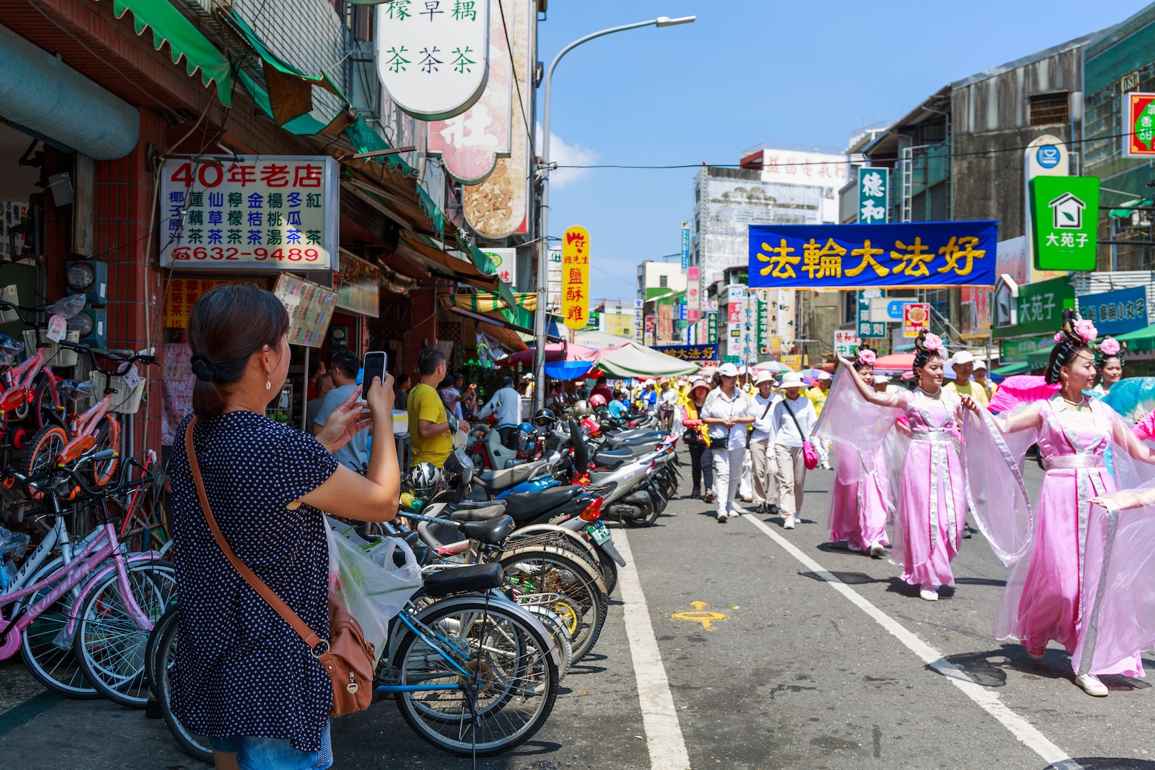不少民众远远听到鼓乐声,早已聚集路旁等待队伍的到来,高举着手机、相机拍照留念。一群年轻人还特别骑着脚踏车追着法轮功队伍走,等待在每一个路口观看。