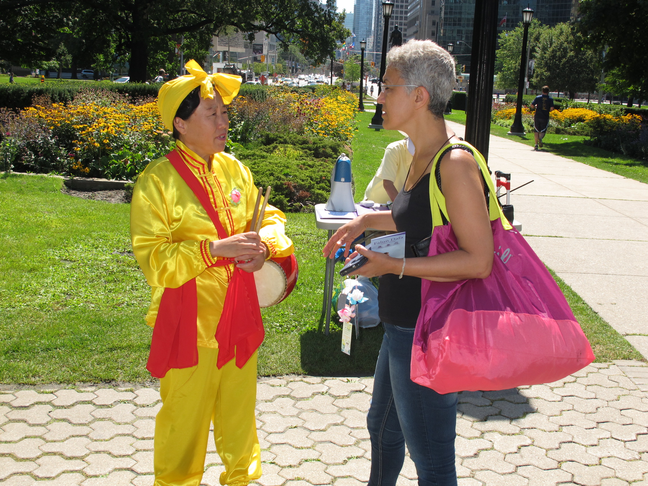 在皇后公园(Queen's Park)集会现场,一位妇女在与法轮功学员李女士交谈。她发自内心地说:“我爱法轮大法!”