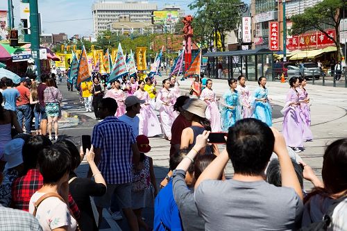 游行经过唐人街,华人踊跃三退