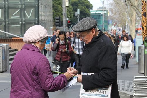 二零一四年八月二十三日,墨尔本晴朗的周末,和煦的阳光带来了春天的活力,感染着市民和游客,熙攘的人群让常年坚守在市中心“城市广场”讲真相的法轮功学员格外忙碌,其间接待了很多来自中国的游客。