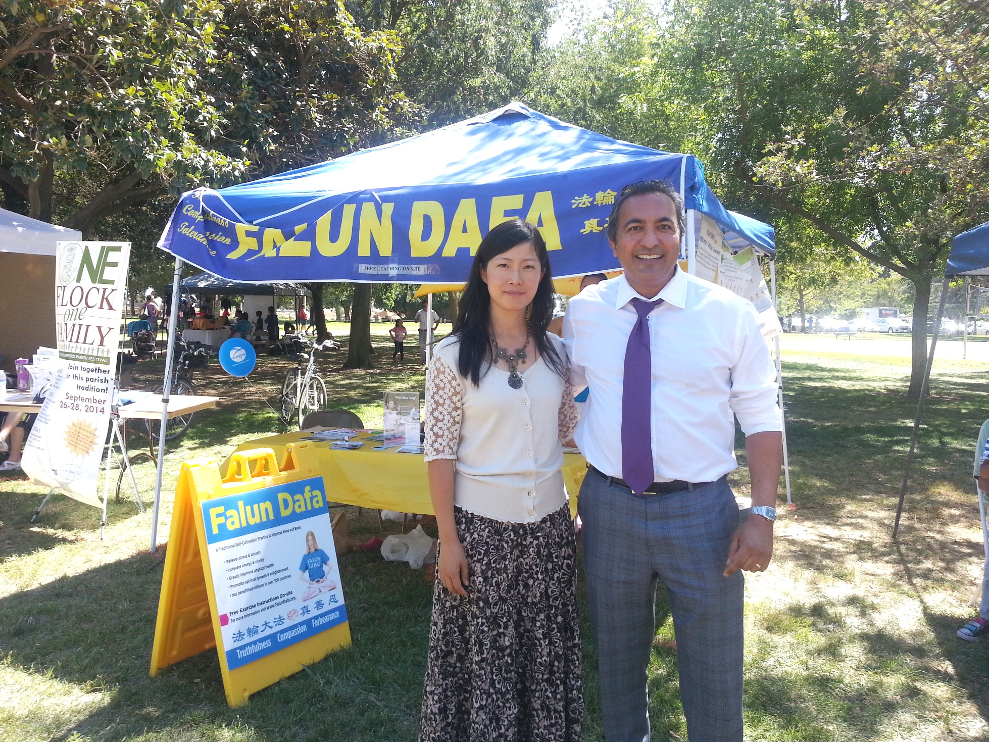 家住麋鹿林市的国会众议员艾米•贝拉(Ami Bera)也前来参加这一庆祝节日。当他看到法轮大法的展位后,热情地同学员打招呼。学员向贝拉议员表达了诉求,希望他能帮助制止迫害,尤其是对法轮功学员大规模的器官活摘。在谈到国会281停止活摘器官的决议案时,艾米告诉学员:“众议院外交事务委员会最近已通过了这项决议的最后审议。”
