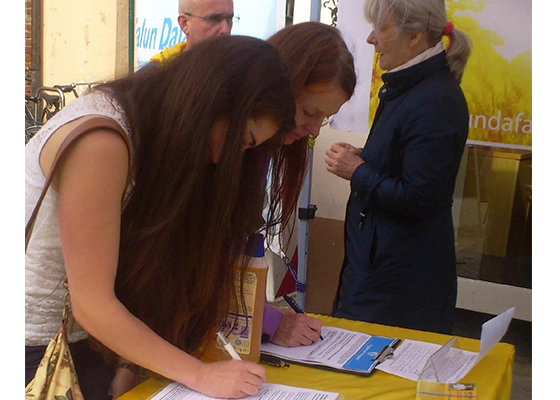 二零一四年八月二十三日,星期六,来自不来梅和下萨克森州的法轮功学员在奥尔登堡的步行街举办信息日,向市民们介绍以“真、善、忍”为修炼原则的法轮功以及法轮功在中国无辜遭受的迫害。