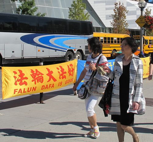 ![]() 来加拿大国家电视塔观光的游客们会看到醒目的法轮功真相横幅 |