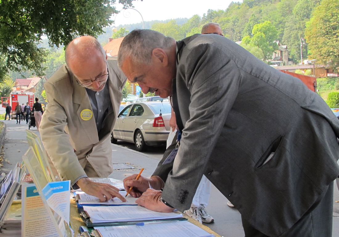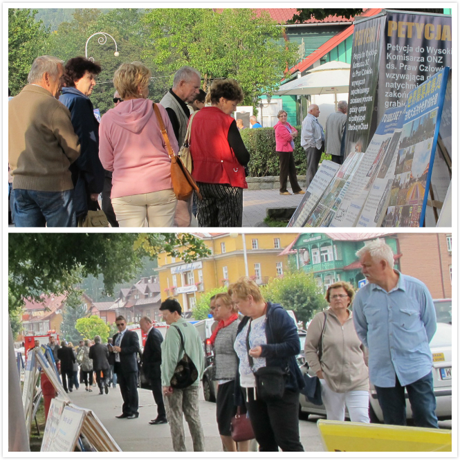 波兰法轮功学员在开幕的当天也来到克雷尼察茲德魯伊,其中一名法轮功学员在会场里讲真相、发《九评》,而其余学员都在会议代表们出入的主要街道上摆放展板,向当地市民、过往游客和各国参会代表讲真相,广发法轮功真相传单,征签反对中共强摘法轮功学员器官的罪行。法轮功学员为此准备了波、英双语征签表,中、波、英三语展板并准备了十多个语种的法轮功真相传单。