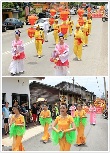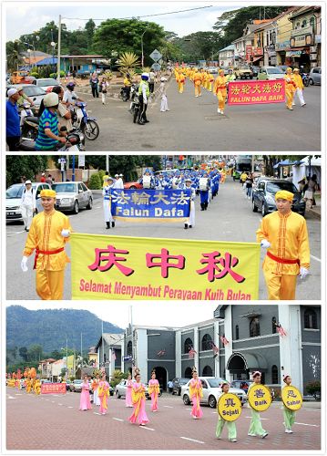 【明慧网二零一四年九月十二日】二零一四年九月六日和七日,中秋节前夕,马来西亚法轮功学员在彭亨州劳勿、文冬和加叻这三个市镇一连举办了三场游行,与民欢庆中秋佳节。阵容壮观的法轮功游行队伍全以传统服饰亮相,将逐渐被现代人所遗忘的传统文化再现大街上,让民众喜出望外,特别而又充满意义的游行迎来民众的好评连连和支持。