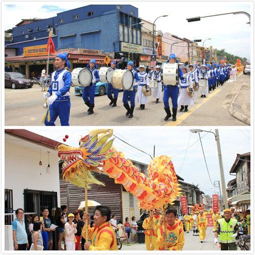 九月六日下午,法轮功学员来到位于彭亨州西部,距离首都吉隆坡约一百一十公里,已有超过百年历史,马来西亚最古老的市镇之一的劳勿(Raub)举行第一场的中秋游行。身着蓝白色中国历史上传统宫廷乐团服饰的天国乐团,演奏着一首接一首震撼人心的乐曲,在警方与志愿警卫队协助开路下,引领整个游行队伍浩荡出发。紧接在后的有身着金黄色传统服装的灯笼队伍、散发着古典韵味的仙女队、以及活灵活现的舞龙队伍。长长的队伍最后方阵是传统腰鼓队的表演,轻快的咚咚鼓声、传递着祥和与喜庆,途经劳勿市区主要大道和华人集中区,所到之处让人们感受到了法轮大法所带来的美好气息。