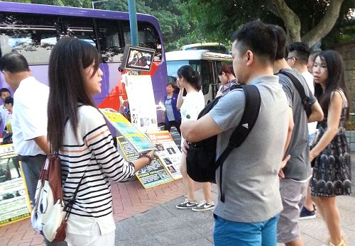 为了让中国游客了解法轮功真相,已经六十九岁的汪淑茹女士今年三月和七月两度专程从澳洲去香港旅游景点讲真相,她和香港“三退”义工们一起默契配合,用真相展板迎接络绎不绝来景点观光的大陆游客。
