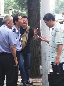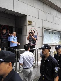 法院审理过程完全被普陀区“610”所操纵。当天,普陀区“610”直接在法院门口现场指挥、布置人手,国保便衣、法警、特警、特保(辅警)、街道居委全部出动,布满法庭内外。警车、特警车、黑色国保便衣车辆随处可见,法院门口与马路对面,一群便衣手持摄像机到处拍摄。