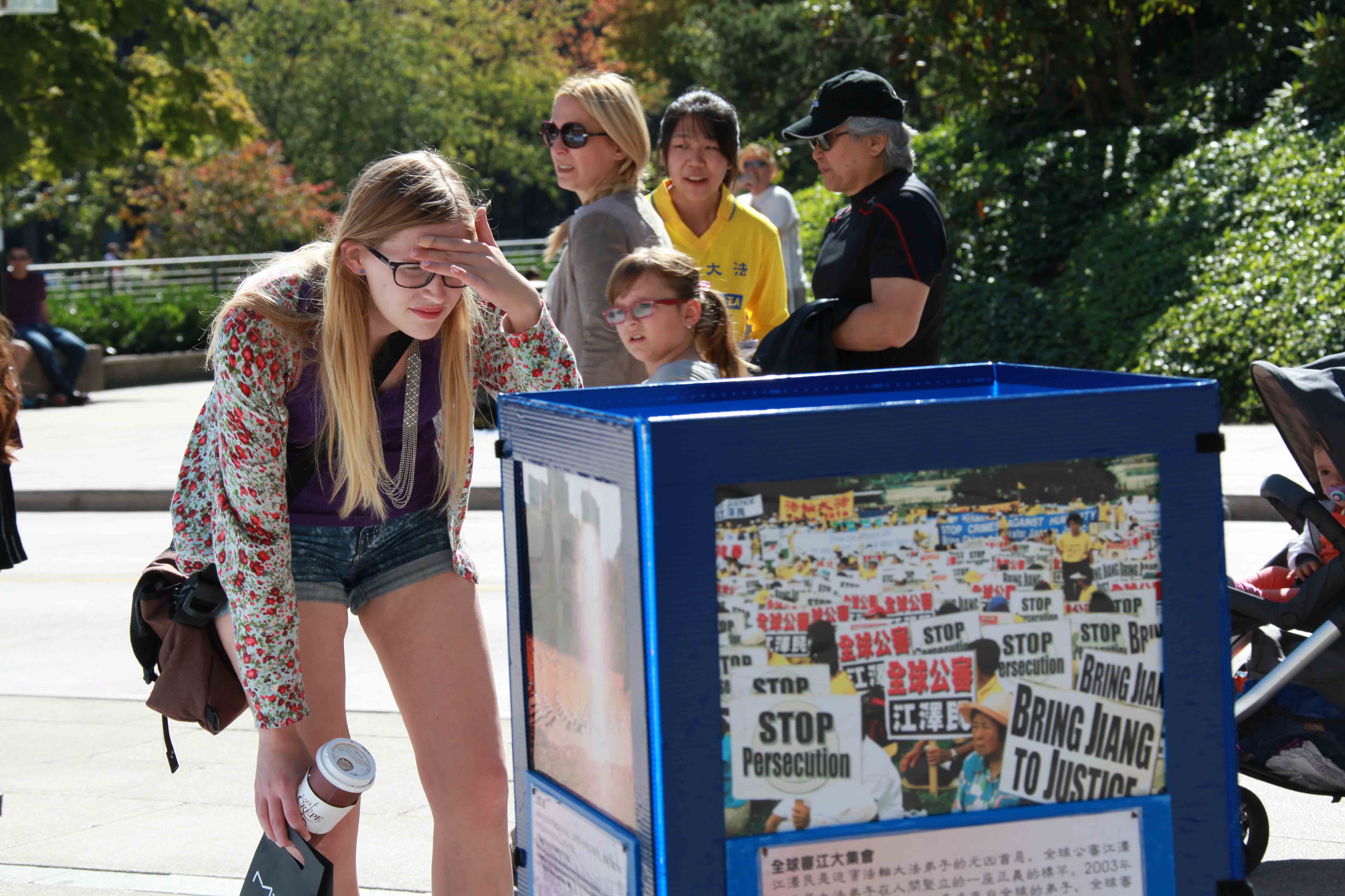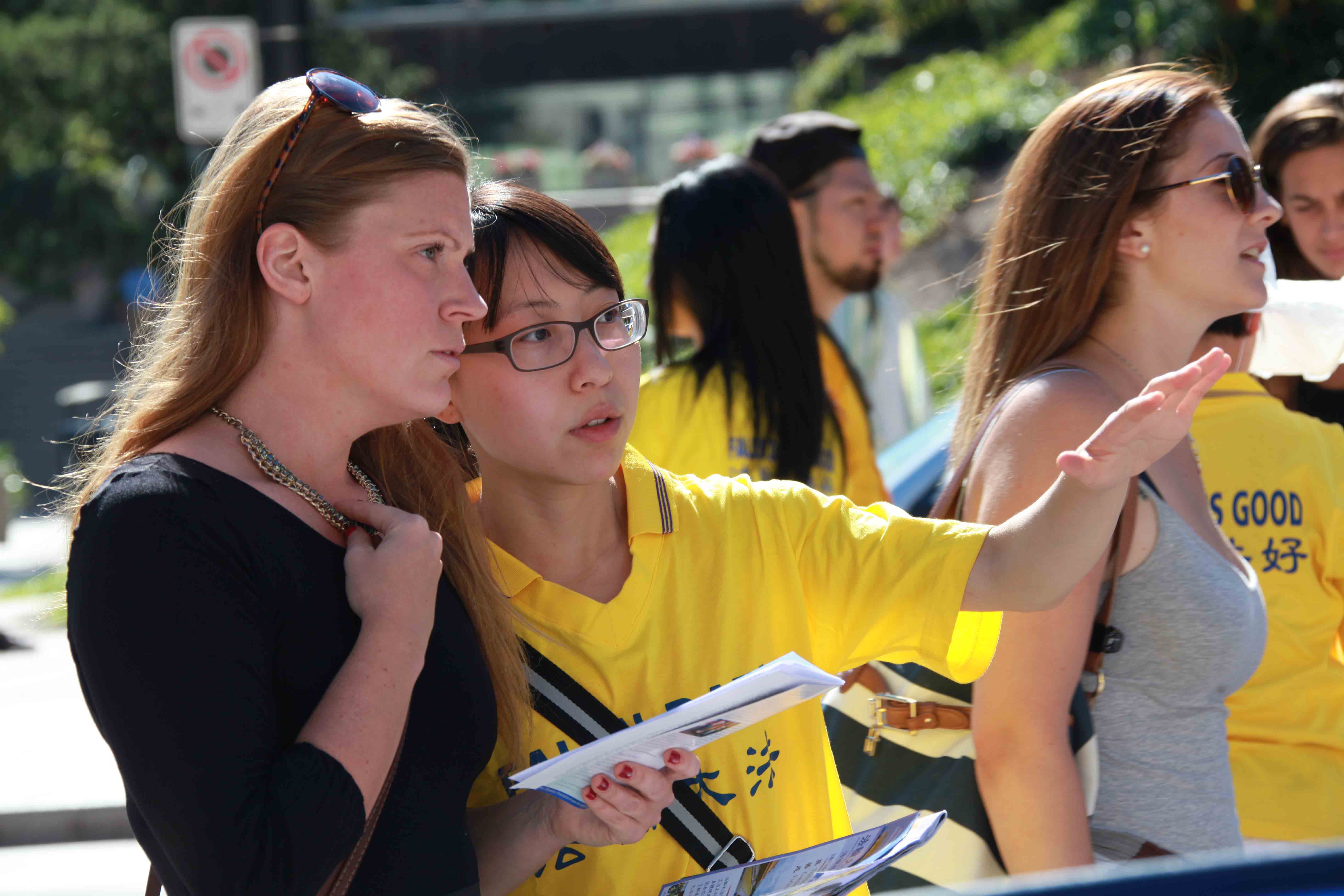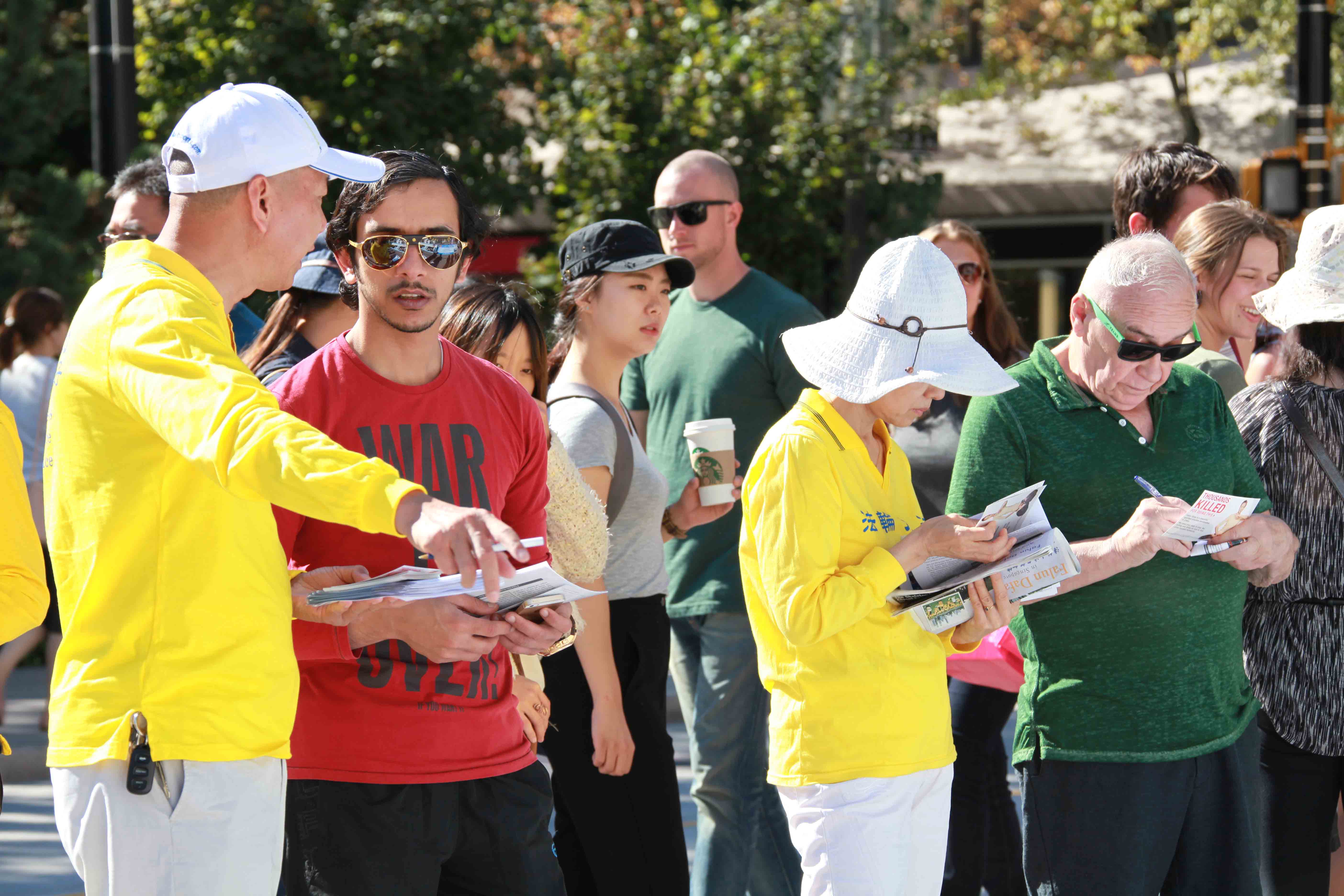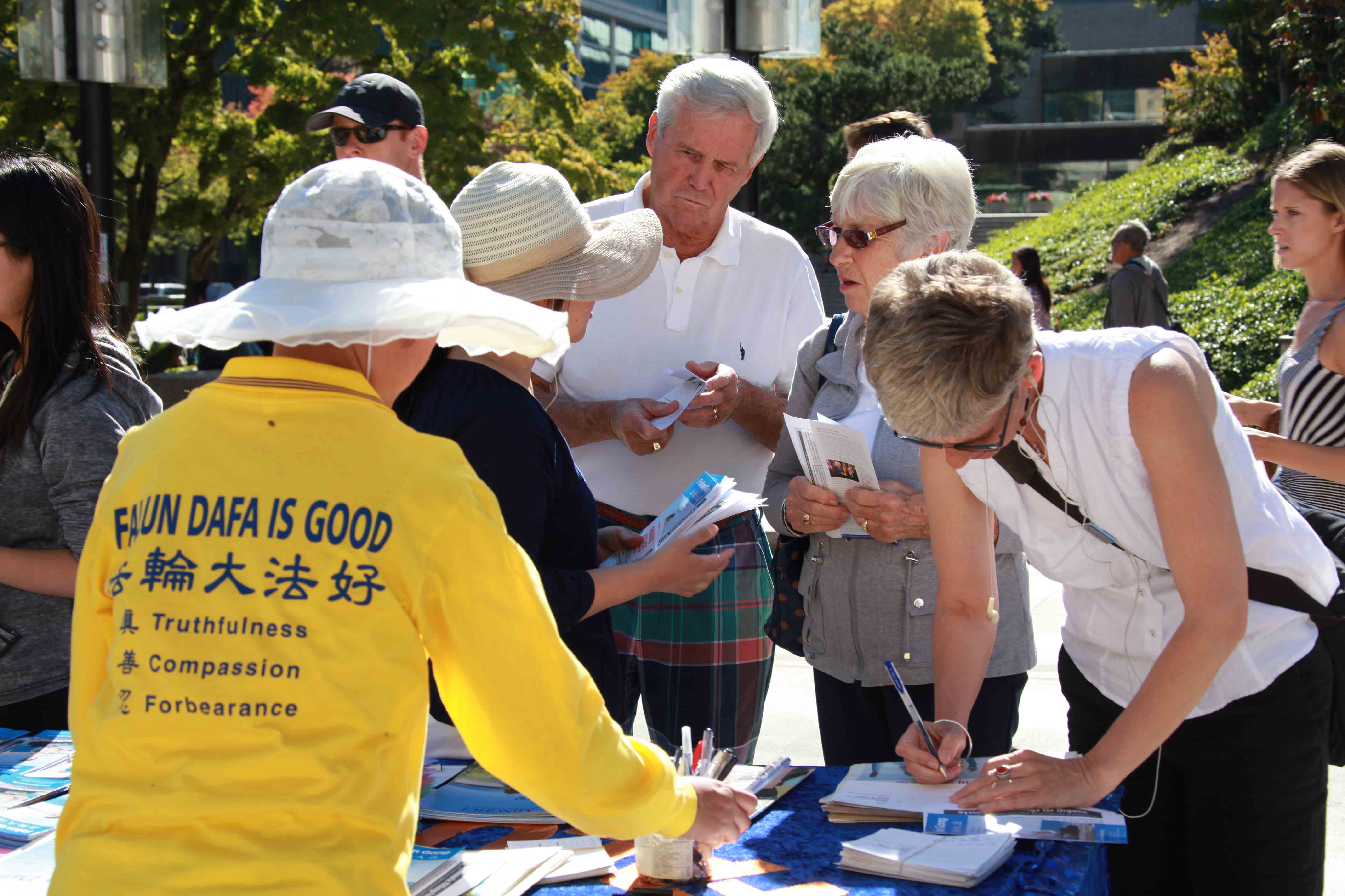 【明慧网二零一四年九月十九日】(明慧记者张然温哥华报道)二零一四年九月十四日,加拿大温哥华法轮功学员在市中心艺术馆附近举行炼功、揭露中共酷刑迫害法轮功学员的“模拟酷刑展”和真相长城等反迫害活动,活动吸引大批市民和行人纷纷签字支持法轮功学员反迫害。