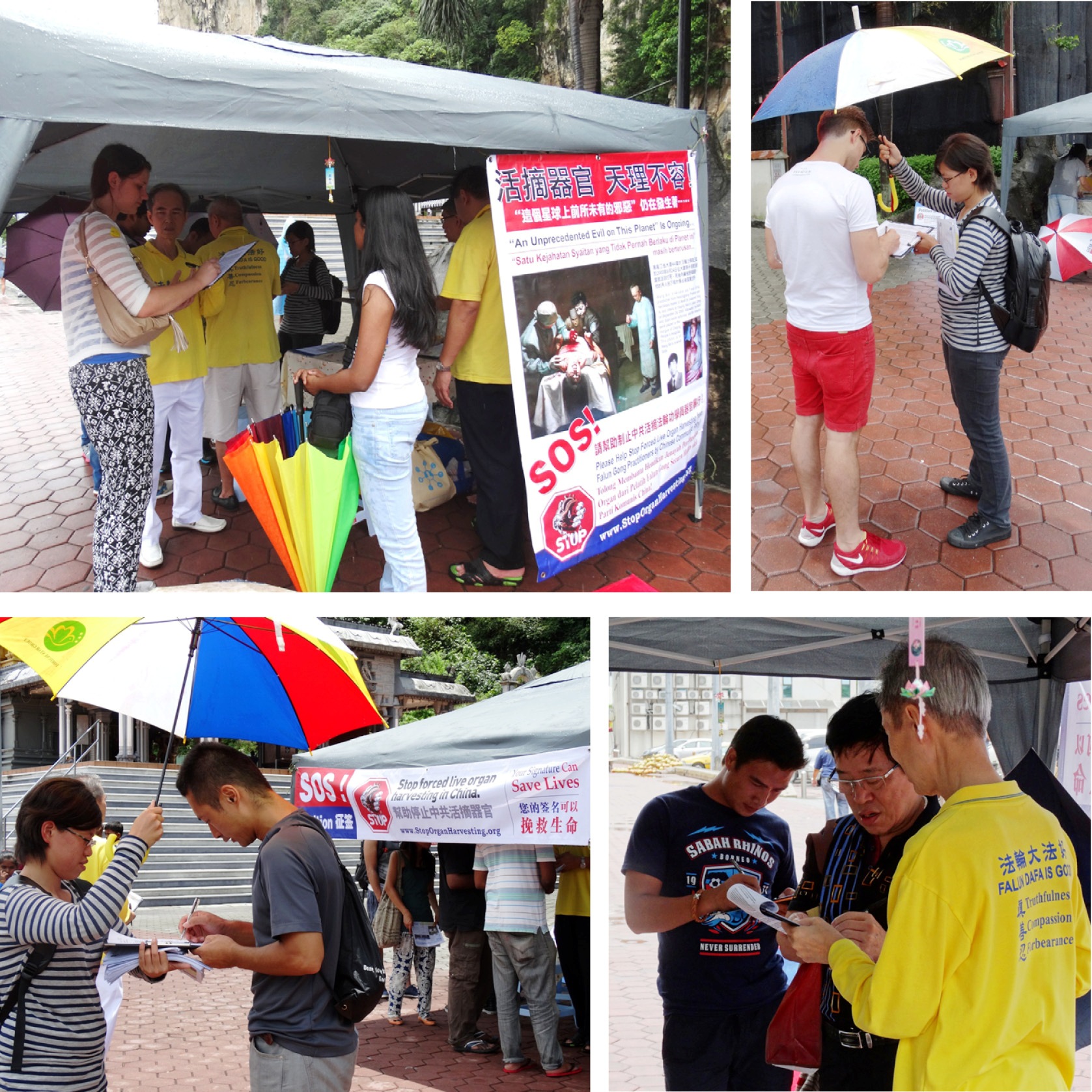 法轮功学员第一天在黑风洞做征签的早上,即遇上下雨天。尽管如此,许多路过的游客,当他们看到征签帐篷外挂着的“帮助停止中共活摘器官”等横幅,在得知中共活摘法轮功学员器官“这个星球上前所未有的邪恶”事实真相后,纷纷签名制止中共活摘器官暴行。