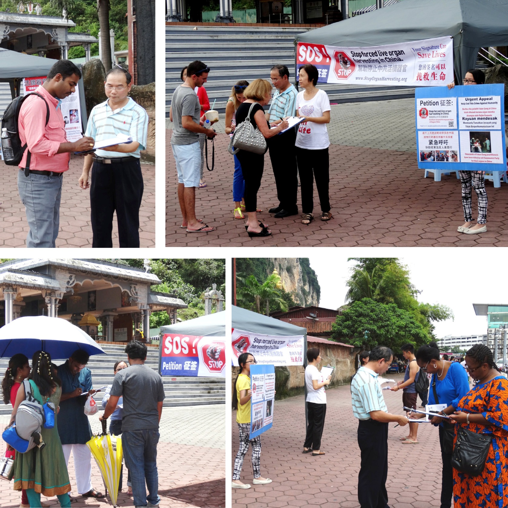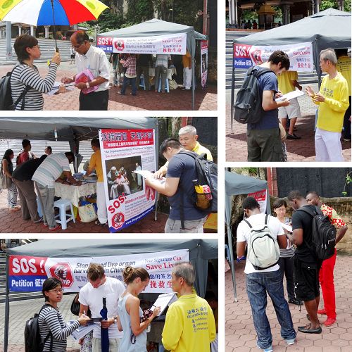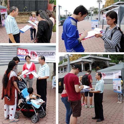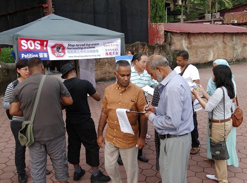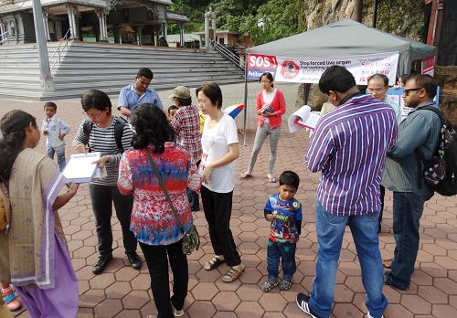 一名时常来黑风洞给猴子喂食的当地印裔男士,当天看到法轮功学员正在做征签,他站着看横幅看了很久、很入心。他跟学员透露,最近有人在脸书(facebook)传发关于中共活摘法轮功学员器官讯息,当时他看了有关讯息和了解真相后感到很伤心、很心痛,还哭了满脸的泪水。他问学员有什么他可以帮忙的吗?学员说,希望他能够签名制止中共恶行,也把相关讯息传达给更多的人知道。他签了名之后,还叫他的朋友也一起来签名。