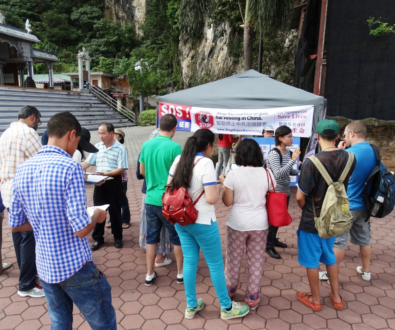 ![]() 在黑风洞景点,来自世界各地不同民族的游客,纷纷签名制止中共活摘器官暴行 |