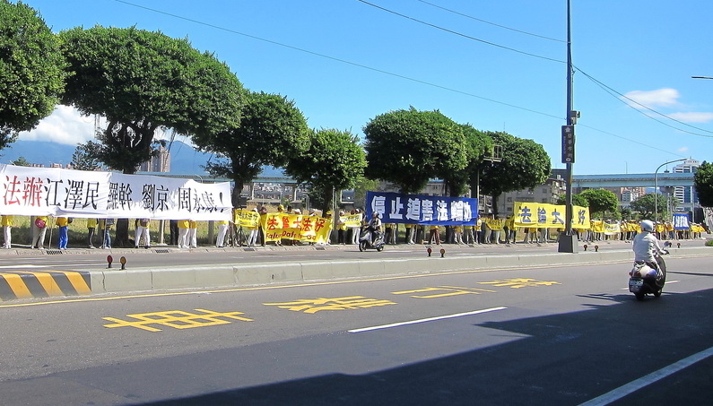 二十日到新北市三重先嗇宫,上百位台湾法轮功学员一早就拉起“法轮大法好”、“停止迫害法轮功”的大型横幅表达抗议。