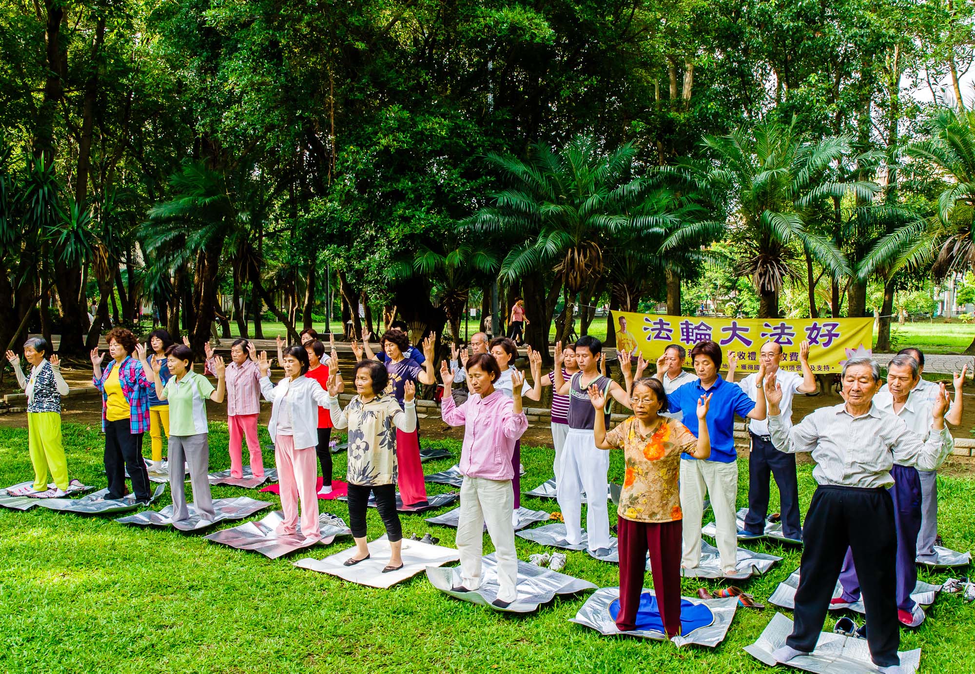 ![]() 在台南东宁公园中央大草地上,清晨人们总会听到悠扬祥和的炼功音乐,法轮功学员在此集体炼功。 |