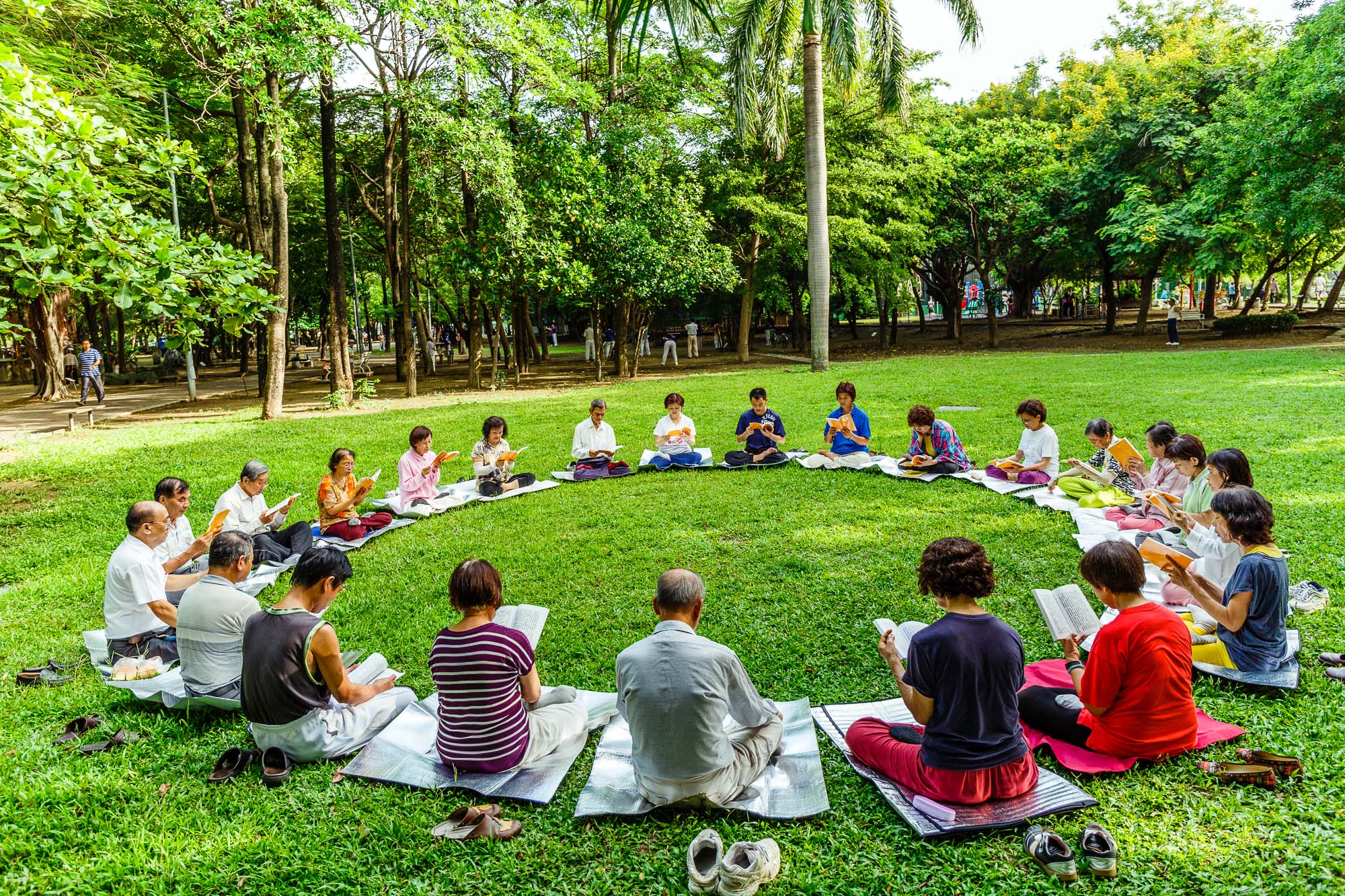 ![]() 在台南东宁公园中央大草地上,法轮功学员炼完五套功法后,继续一起学法一个半小时。 |