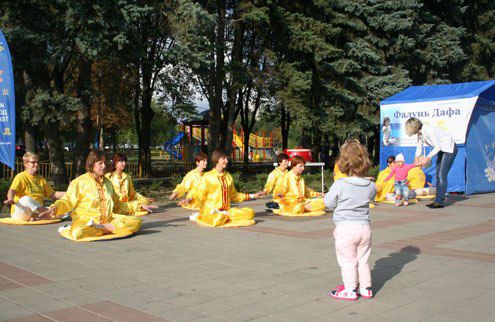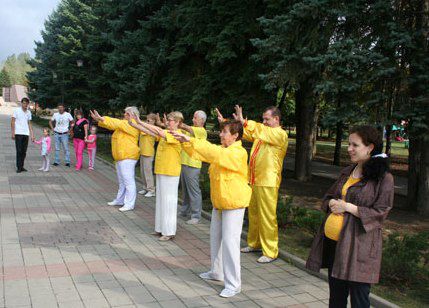 很多人被法轮功学员的活动深深吸引,观看很久也不愿离去。几位学员在人群中派发真相资料,解答人们的问题。一些观众对功法产生浓厚兴趣,询问教功地点和哪里能请到法轮功书籍。